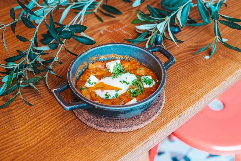 Haricots géants, petits légumes à la tomate, feta & œuf parfait