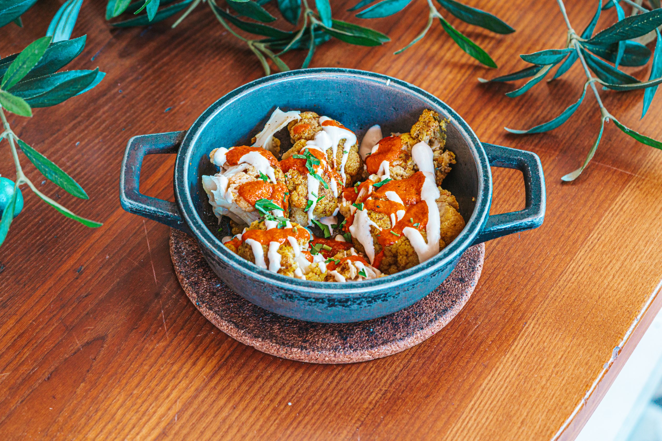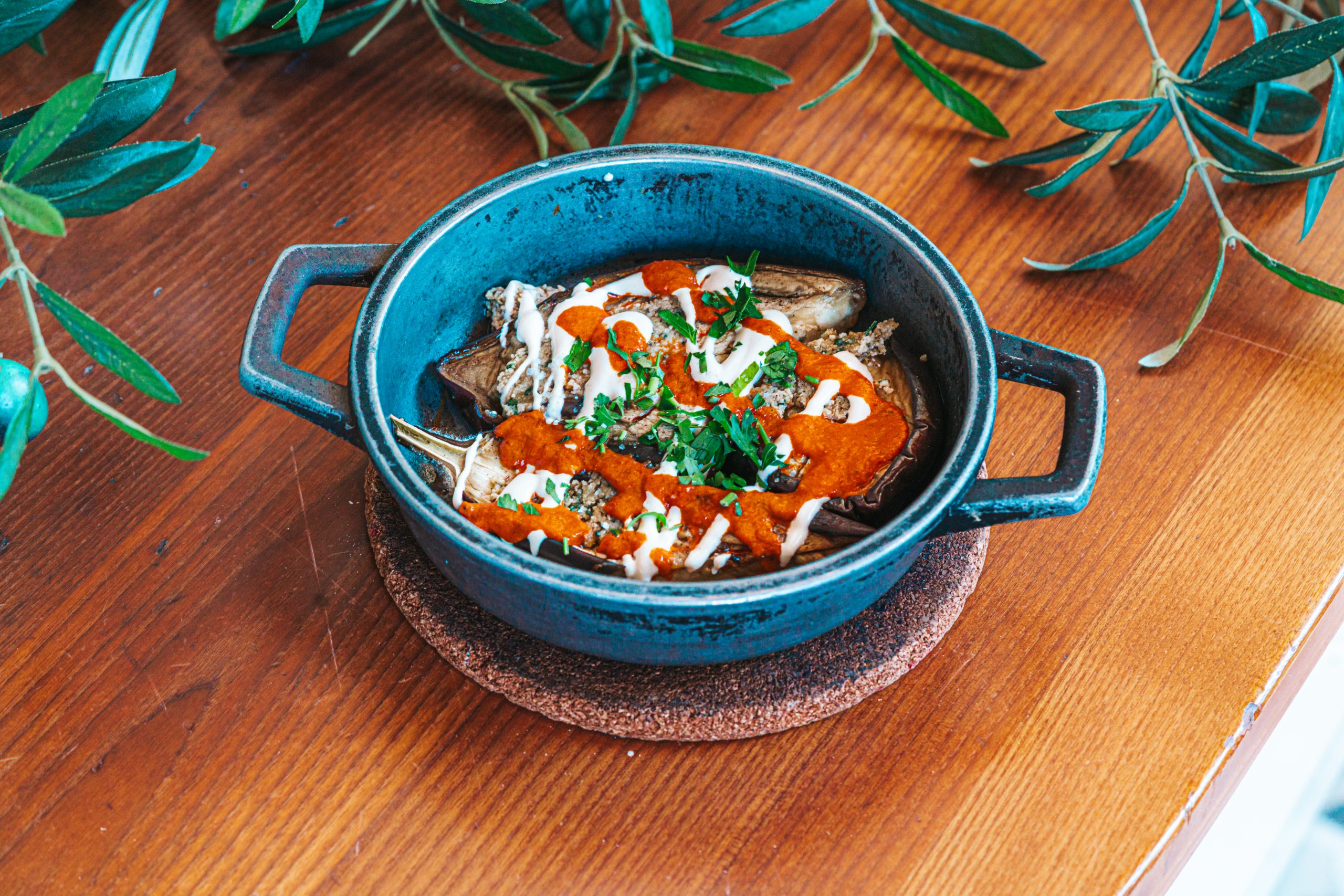 Tomate, calabacín con baharat, berenjenas con especias suaves, pimientos, cebolla roja, pesto rojo y salsa tarator