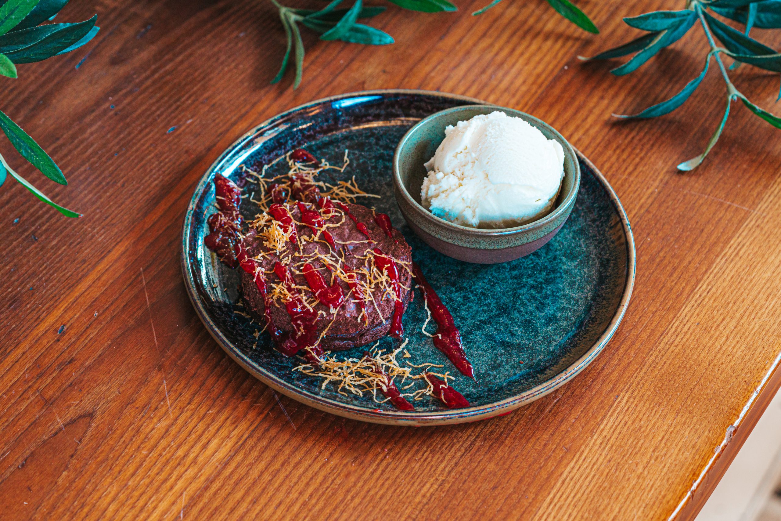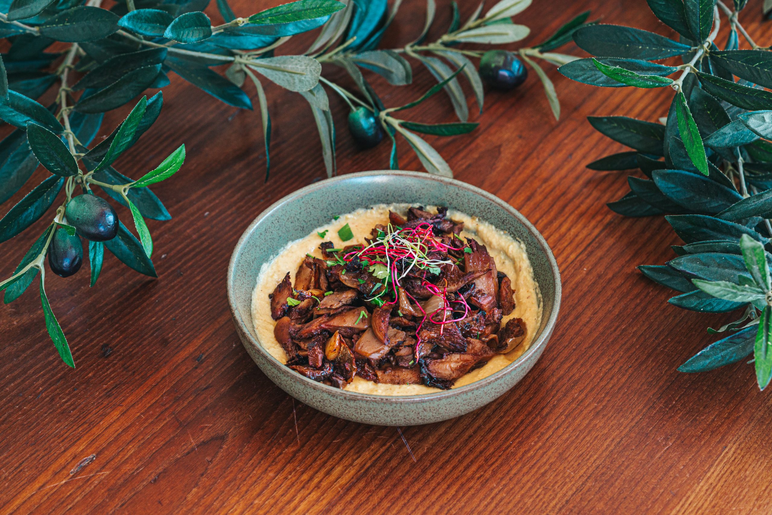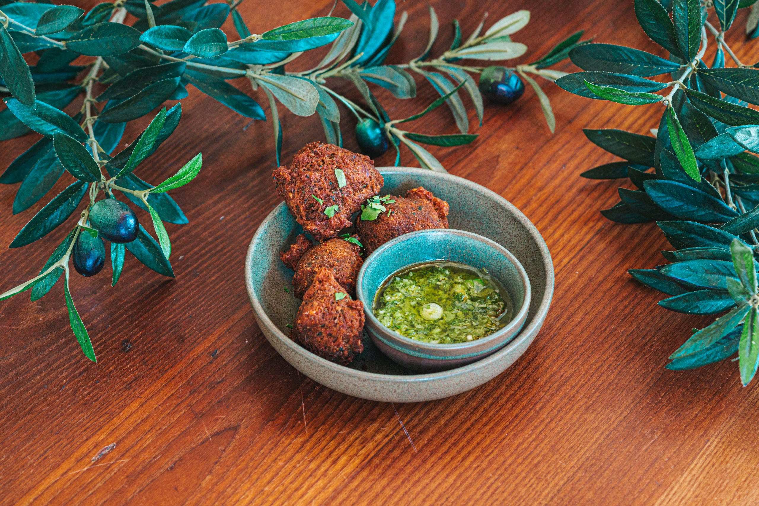 Hummus de sésamo + Croqueta de batata dulce, perejil, cebolla y melaza de granada.