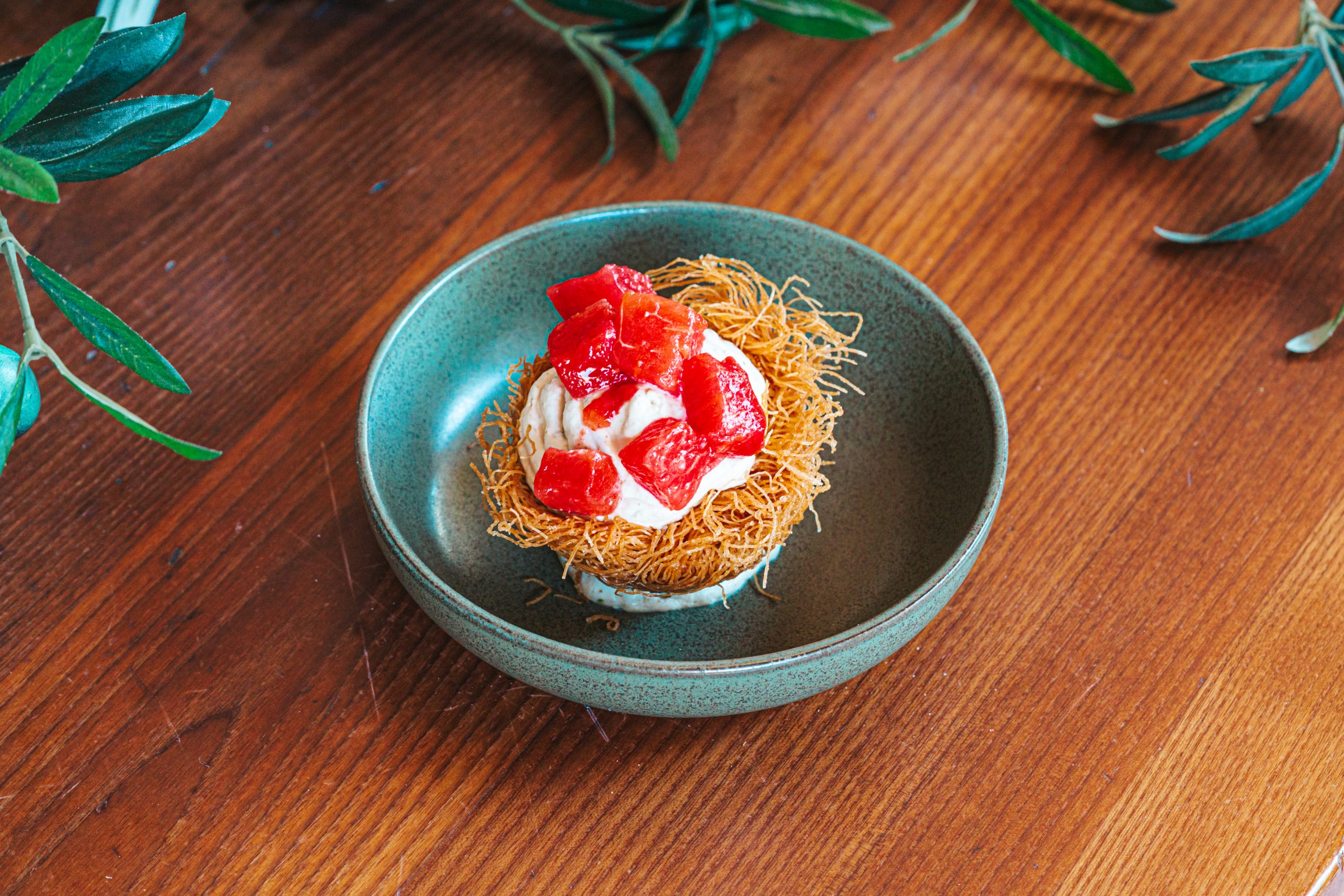Yogur griego, mezcla de queso Tulum, tomates secos, chalotas & chile suave, nigella & perejil