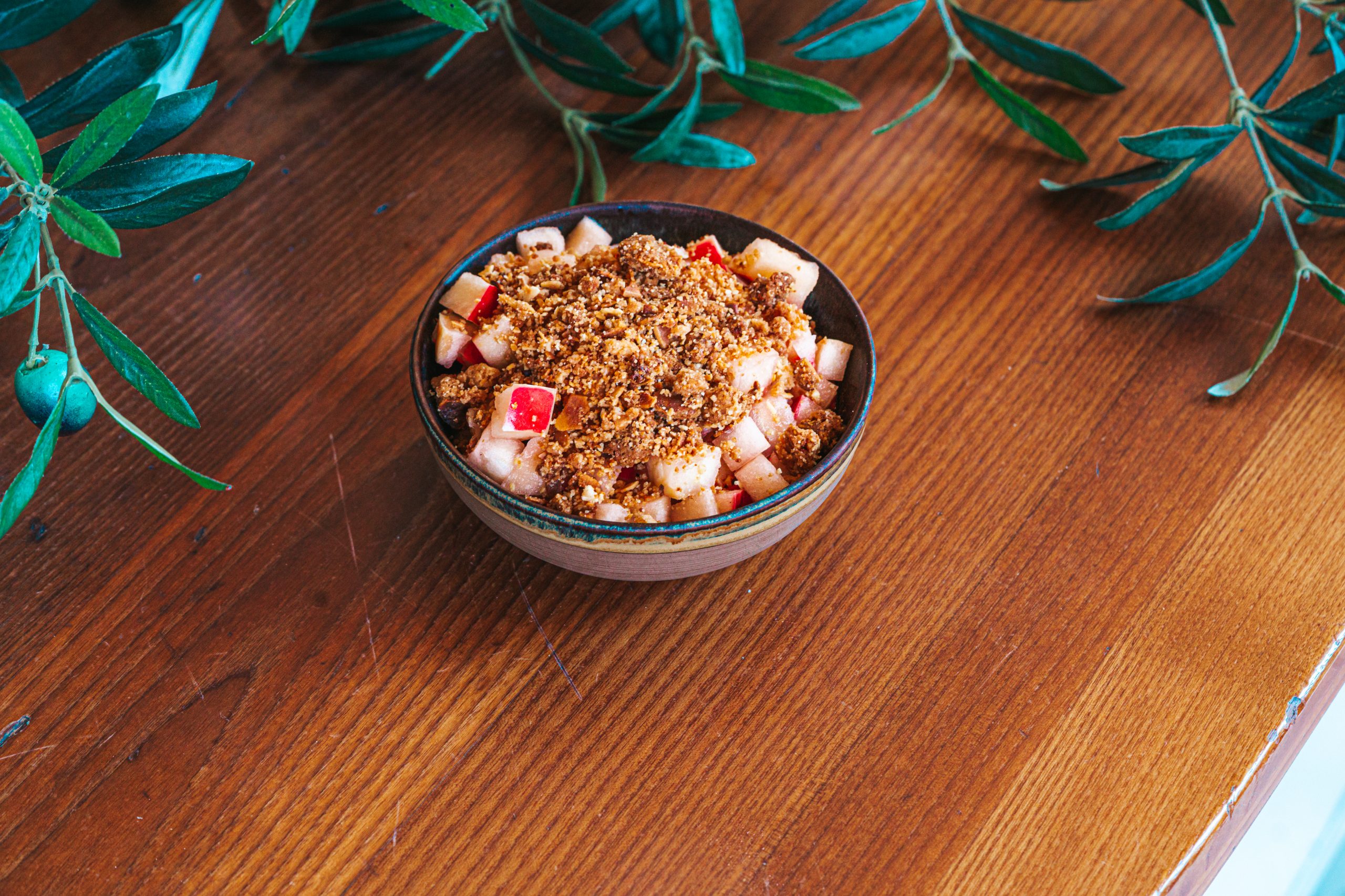 12,00 €Bulgur con especias suaves, cebolla roja, tomates cherry, pepino, granada, menta, pasas, perejil, vinagreta de sésamo y miel